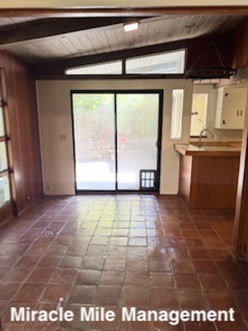 **Open kitchen with tile flooring and seamless flow to the living room and sun-dappled patio