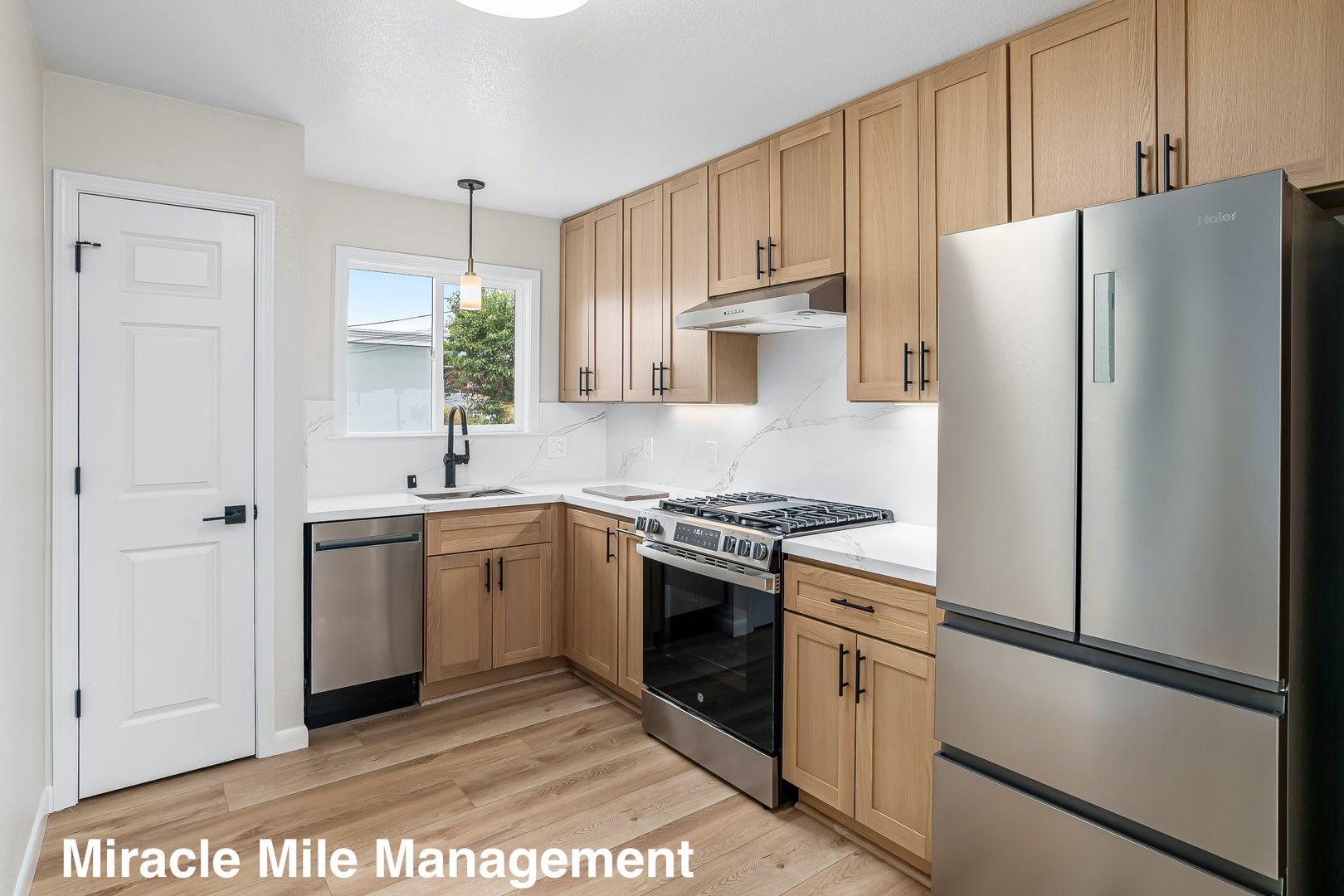 Sleek stainless steel appliances, including a refrigerator, gas stove, dishwasher, and range hood