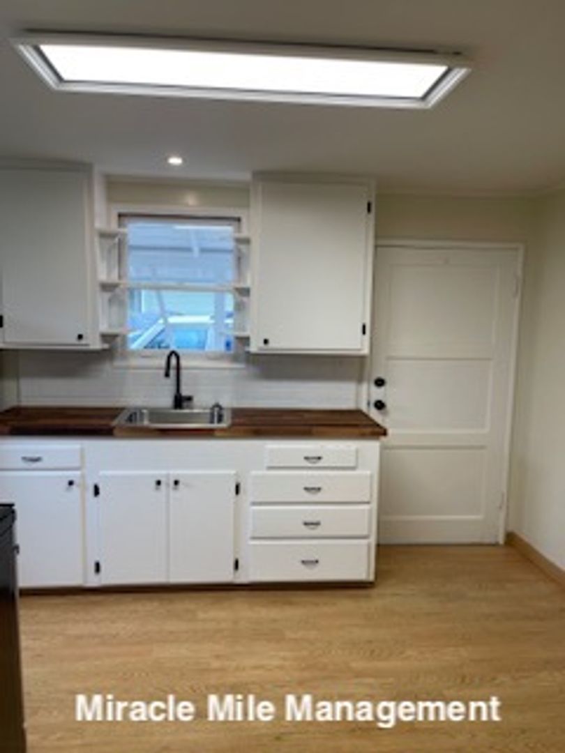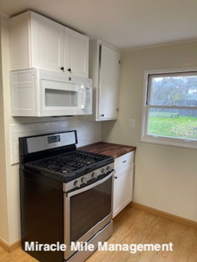 Modern eat-in kitchen with butcher block counters, black faucet, black handles, built in microwave, gas stove and refrigerator. Full bathroom with large tiled shower. Large Private fenced yard, bring our green thumb.