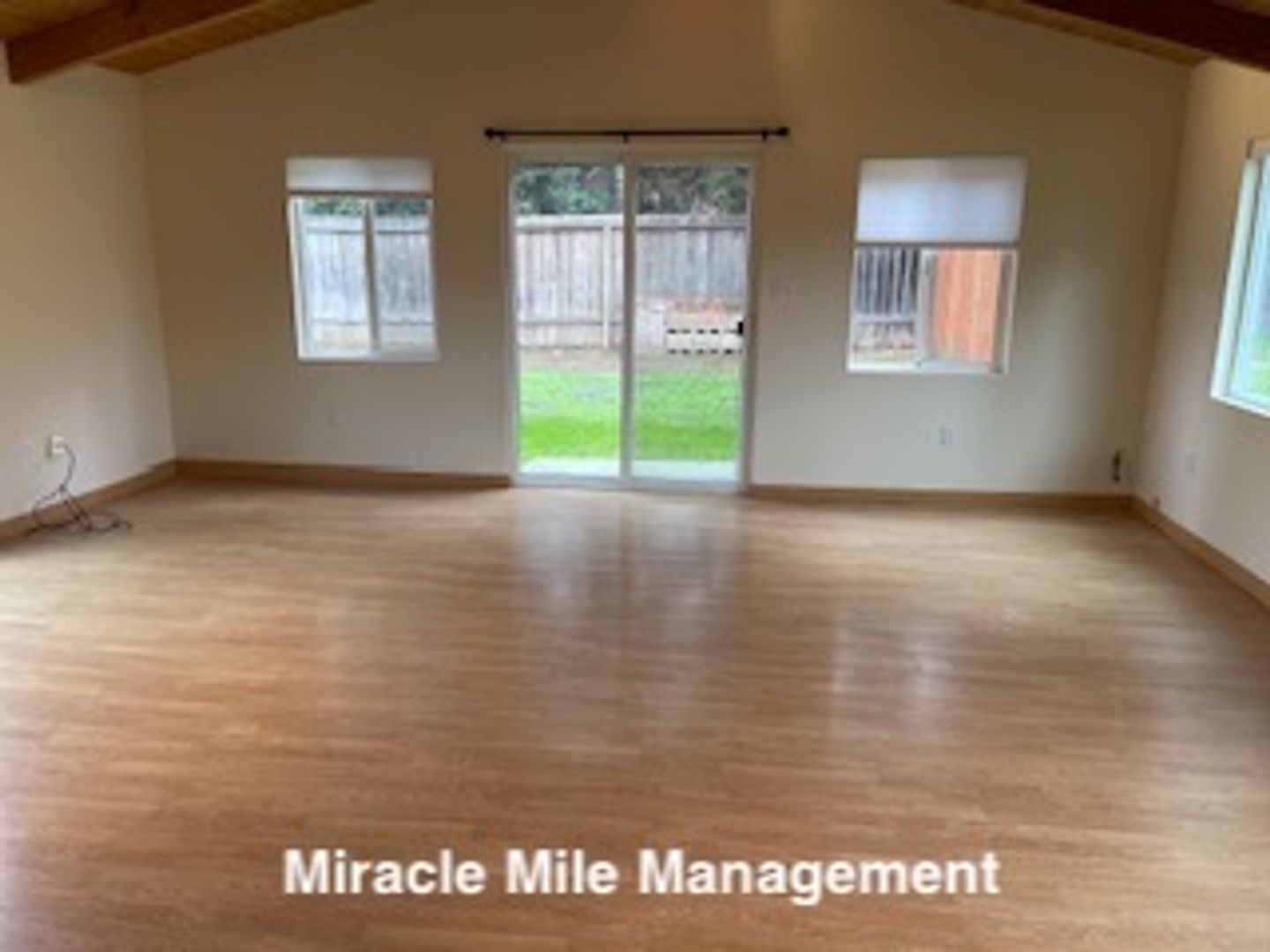 Spacious and light filled living room with vaulted ceiling, laminate floors and access to private yard.